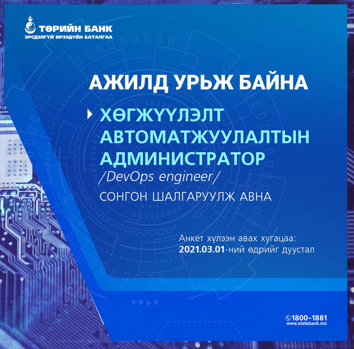 Дээрх ажлын байрыг сонирхсон ажил горилогчид 2021 оны 03 дугаар сарын 01- ний өдрийг дуустал Төрийн банкны вэб сайтаар орж, онлайн анкетаа ирүүлнэ үү.