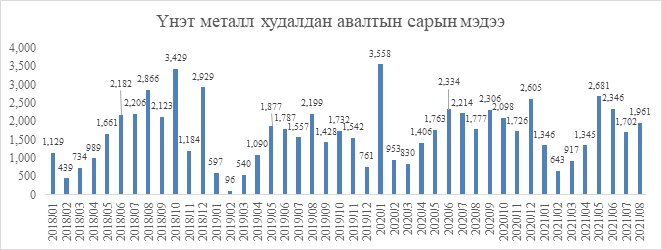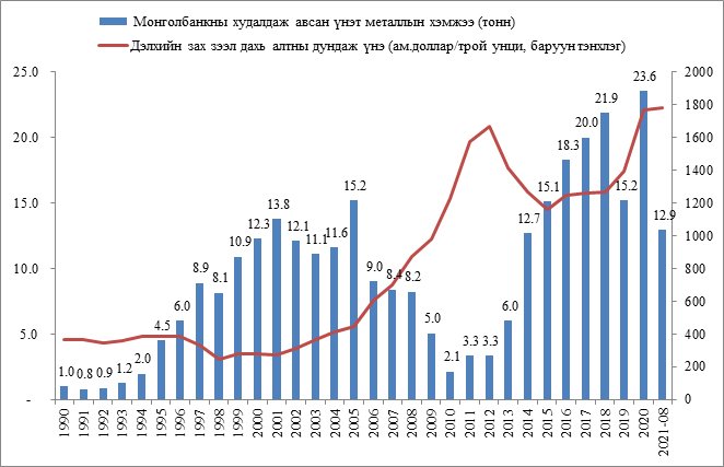 Монголбанк 2021 оны 8 дугаар сард 1.9 тн үнэт металл худалдан авч, оны эхнээс өссөн дүнгээр нийт 12.9 тн үнэт металл худалдан аваад байна. Энэ нь өмнөх оны мөн үетэй харьцуулбал 1.8 тн-оор буурсан үзүүлэлт юм.