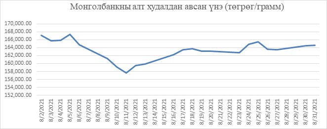 Монголбанкны 1 грамм алт худалдан авах дундаж ханш 2021 оны 8 дугаар сард 163,323.50 төгрөг байлаа.