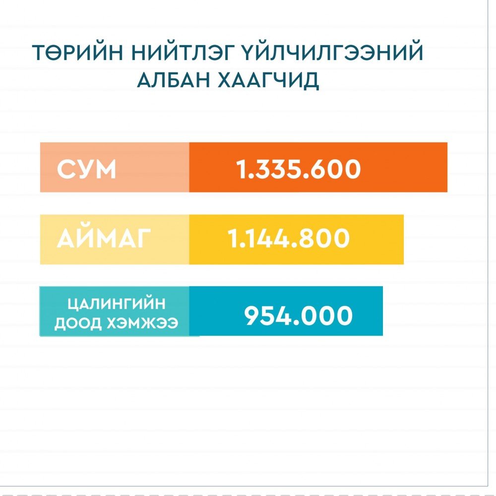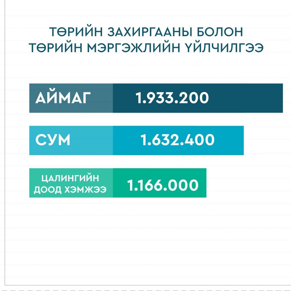 Төрийн захиргааны болон төрийн мэргэжлийн үйлчилгээний албан хаагчдын цалингийн доод хэмжээг 1.166.000 төгрөг болно. Төрийн нийтлэг үйлчилгээний албан хаагчдын цалингийн доод 954.000 төгрөг болно гэв.