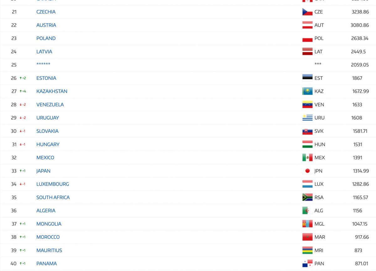 Тэгвэл дэлхийн чансааг тэргүүлэгч гурван багийн байрт өөрчлөлт гарсангүй, Бельги /20424.7/, Словен /17070.1/, Испани /15724.4/ тэргүүлж явна. Харин зургаадугаарт байсан Итали /13149.5/ хоёр байр өгсөж дөрөвт, долоодугаарт байсан Нидерланд /11968.3/ мөн хоёр байр өгсөж тавдугаарт бичигдсэн бол Дани таваас зургаа руу, /11889.8/ Франц /11576.8/ дөрвөөс долоо руу буужээ.