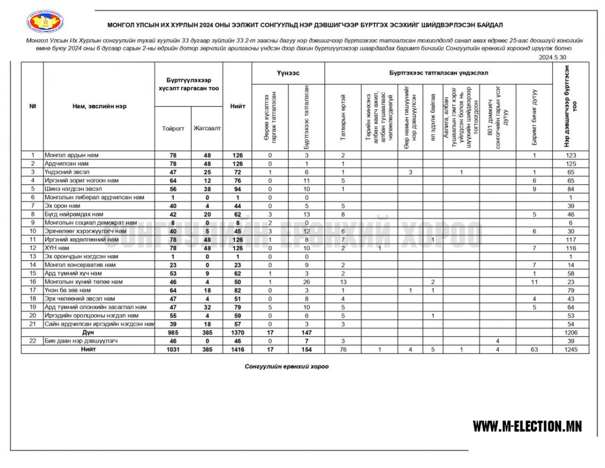 Монгол Улсын Их Хурлын Сонгуулийн тухай хуулийн 33 дугаар зүйлийн 33.2-т заасны дагуу 2024 оны 6 дугаар сарын 2-ны өдрийн дотор бүртгэхээс татгалзсан зөрчлийг арилгаж, дахин бүртгүүлэхээр шаардагдах баримт бичгийг СЕХ-нд ирүүлэх боломжтой юм. Тиймээс хуульд заасан хугацаанд нэр дэвшигчид холбогдох лавлагаа авах боломжоор ханган нийтээр тэмдэглэх баяр болон амралтын өдөр ажиллах хүсэлтийг СЕХ-ноос холбогдох байгууллагуудад хүргүүлэв.