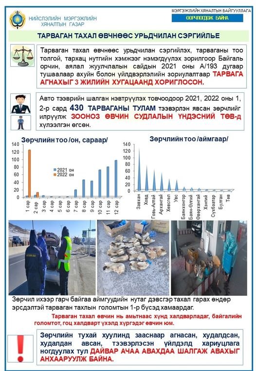 Тэгвэл 2021, 2022 оны нэг болон хоёрдугаар сард Авто тээврийн шалган нэвтрүүлэх товчоодоор нийт 430 тарваганы тулам тээвэрлэн явсан зөрчлийг илрүүлж, Зооноз өвчин судлалын үндэсний төвд хүлээлгэн өгчээ.