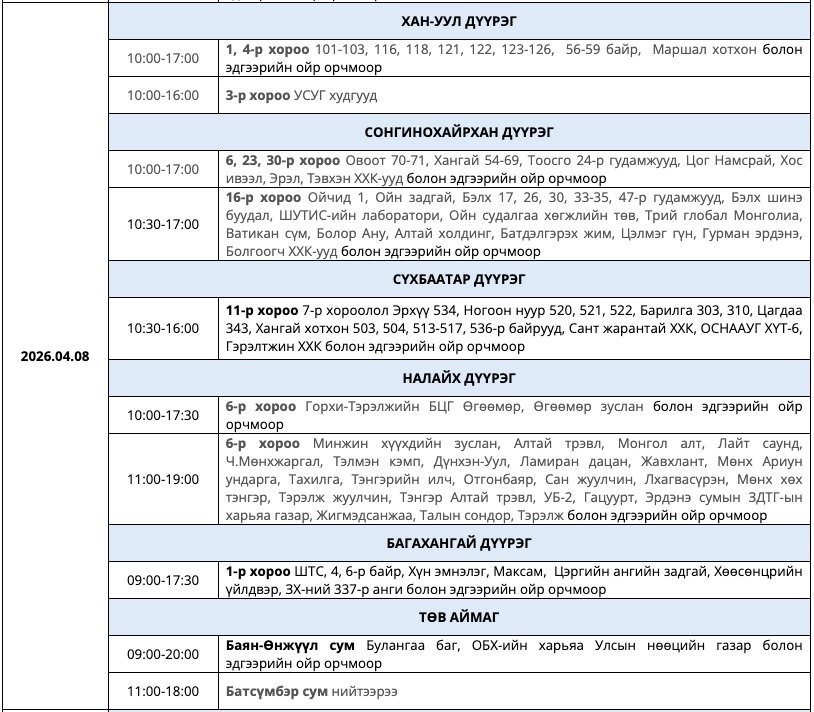 Дөрөвдүгээр сарын 8-ны лхагва гарагт цахилгааныг тодорхой хугацаанд хязгаарлаж, засвар үйлчилгээ хийх байршлуудын мэдээллийг хүргэж байна.