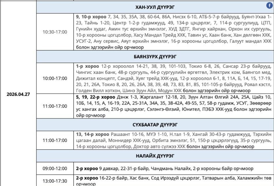 Өнөөдөр дөрвөн дүүрэгт цахилгаан хязгаарлана. Ирэх долоо хоногт цахилгаан шугам тоноглолд засвар хийх тоймчилсон байршил, цагийн хуваарийг УБЦТС ТӨХК-иас мэдээллээ.