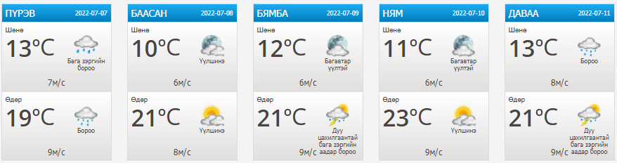 Салхи: Ихэнх хугацаанд секундэд 6-11 метр, борооны өмнө түр зуур ширүүсэж, 6-нд Алтайн салбар уулсаар, 7-нд говь, талын нутгаар секундэд 13-15 метр хүрч ширүүсэж, шороон шуурга шуурна.