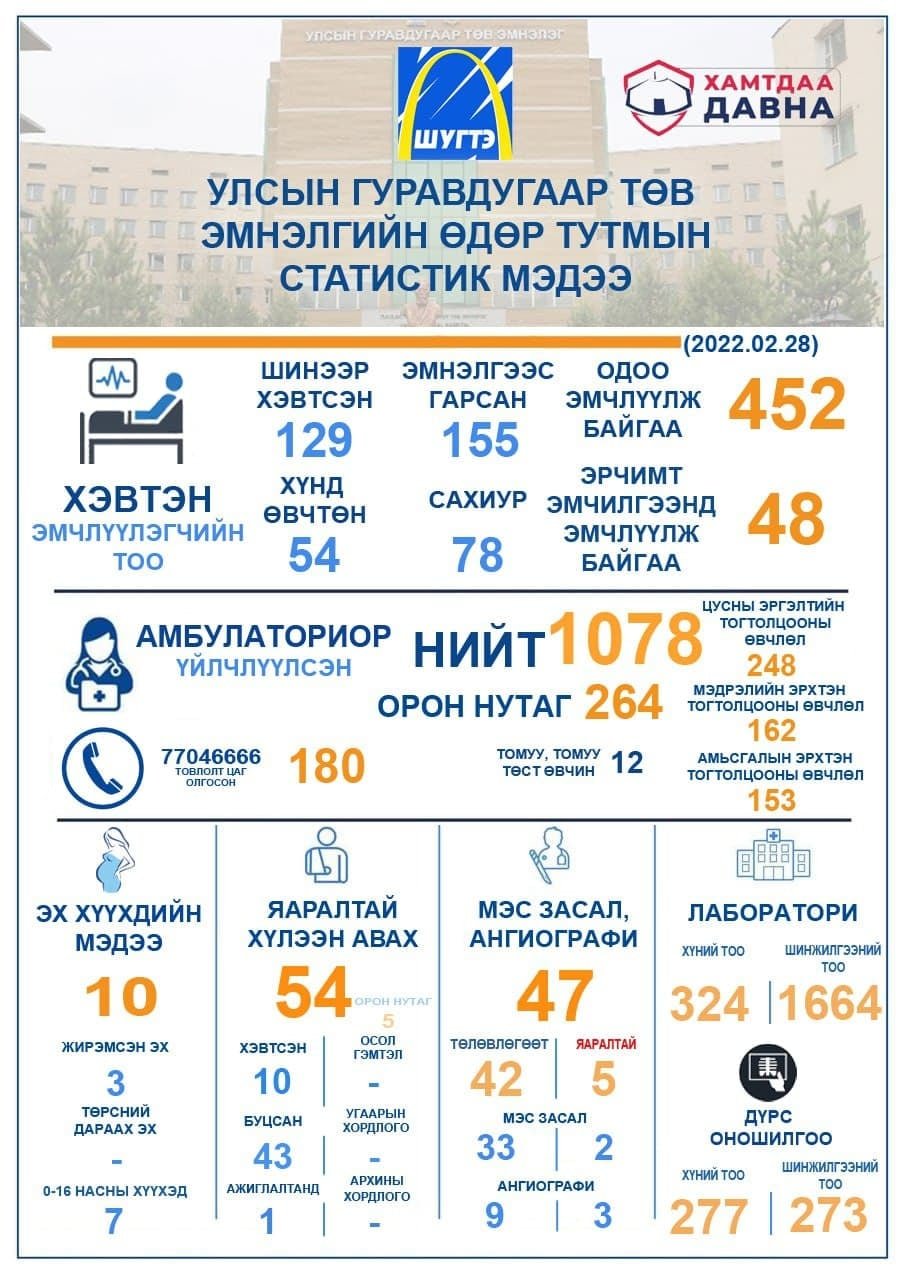 Мөн энэ хугацаанд төлөвлөгөөт 37, яаралтай 11 мэс засал амжилттай хийгджээ. Яаралтай хүлээн авахаар 78 иргэн тусламж үйлчилгээ авсны 30 нь эмнэлэгт хэвтсэн байна.