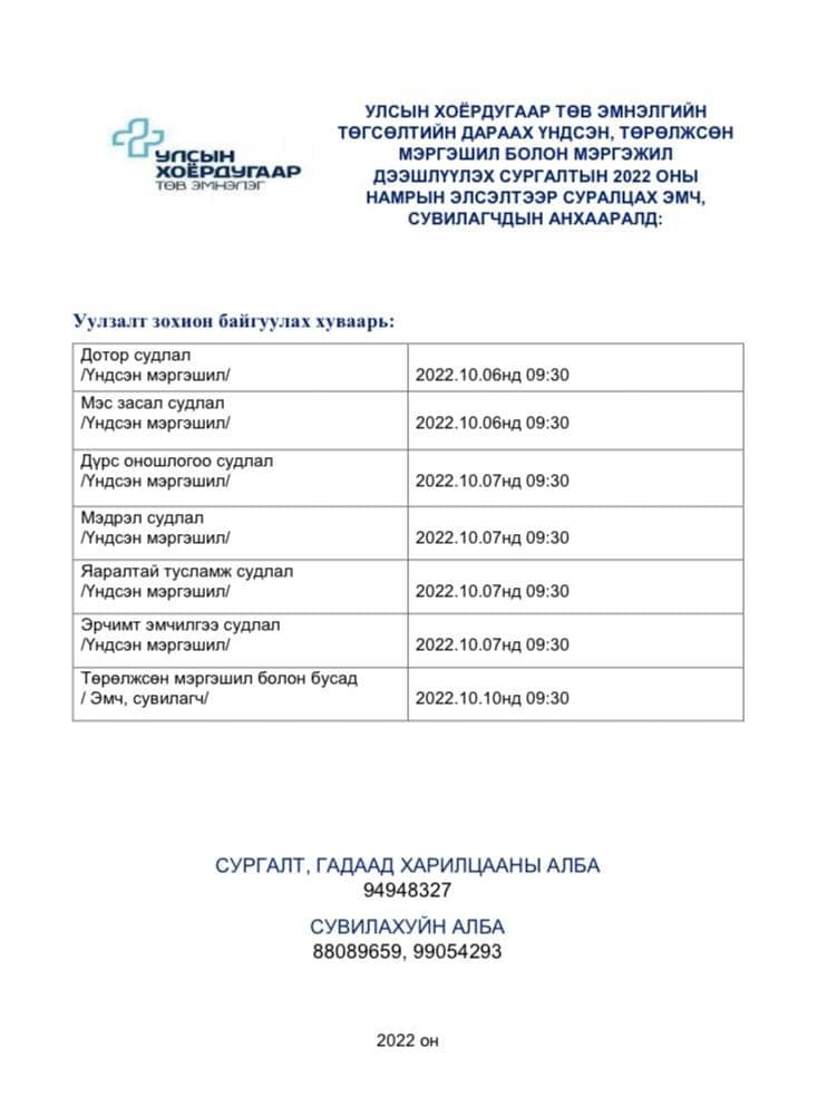 Улсын хоёрдугаар төв эмнэлэгийн төгсөлтийн дараах үндсэн, үндсэн төрөлжсөн мэргэжшил болон мэргэжил дээшлүүлэх сургалтын 2022 оны насрын элсэлтээр суралцах эмч, сувилагчдын АНХААРАЛД: