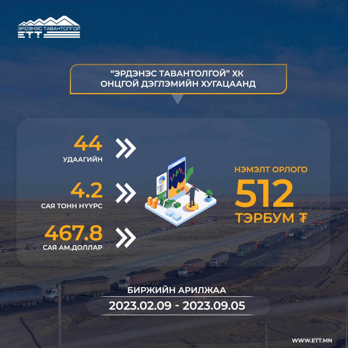 “Эрдэнэс Тавантолгой” ХК-д Онцгой дэглэм тогтоосон 10 сарын хугацаанд 44 удаагийн биржийн арилжааг амжилттай зохион байгуулж 467.8 сая ам.долларын өртөг бүхий 4.2 сая тонн нүүрс борлууллаа.