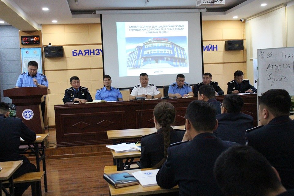 Баянзүрх дүүрэг дэх Цагдаагийн газрын гуравдугаар хэлтсээс 2019 оны 3 дугаар улирлын тайлангийн хурал, сахилга ёс зүйн зөвлөгөөнийг амжилттай зохион байгууллаа. Тайлангийн хурлаар үр дүнгээ хэлэлцэж, цаашид анхаарах, эрчимжүүлэх ажлуудаа төлөвлөн хариуцсан чиглэлийн алба хаагчдад үүрэг чиглэл өгсөн байна.
