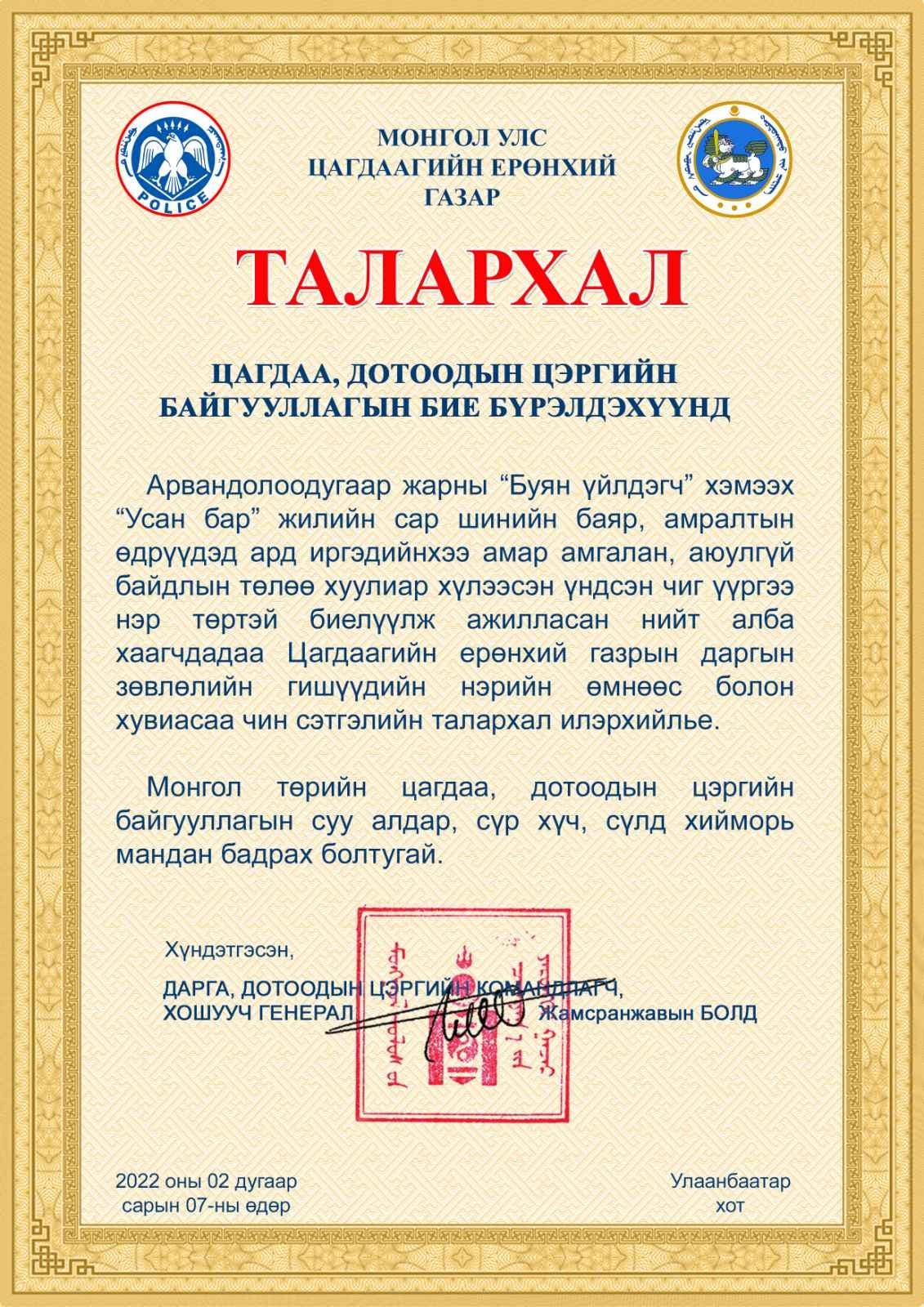 Цагдаагийн ерөнхий газрын дарга, Дотоодын цэргийн командлагч, хошууч генерал Ж.Болд "Талархал" илэрхийллээ.