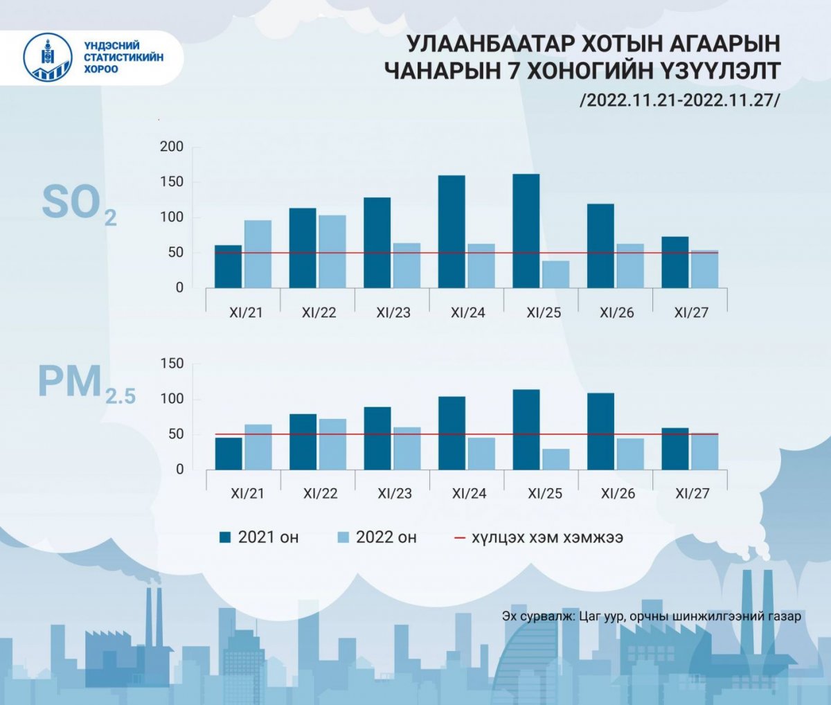 Тухайлбал, 2022 оны арваннэгдүгээр сарын 21-27-ны өдрүүдийн Улаанбаатар хотын агаарын чанарыг өмнөх оны мөн үетэй харьцуулсан үзүүлэлтээс харахад, агаарын чанар 13 дугаар хороолол, Амгалан, Зайсан, Мишээл экспо, Ургах наран хороолол орчим “Цэвэр” болон “Хэвийн” байсан бол Баянхошуу, Хайлааст орчим “Бохирдолтой” түвшинд хүрснийг ҮСХ-ноос Цаг уур, орчны шинжилгээний газрын мэдээлэлд үндэслэн, инфографик хэлбэрээр хүргэлээ.