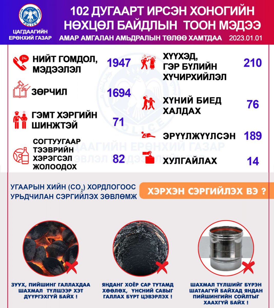 Энэ сарын 01-нд буюу өчигдөр цагдаагийн байгууллагын 102 дугаарын утсанд нийт 1947 гомдол мэдээлэл бүртгэгджээ. Үүнээс зөрчлийн дуудлага мэдээлэл 1694, хулгайтай холбоотой 14, хүүхэд, гэр бүлийн хүчирхийллийн дуудлага 210, гэмт хэргийн шинжтэй 71 мэдээлэл бүртгэгдсэн байна.