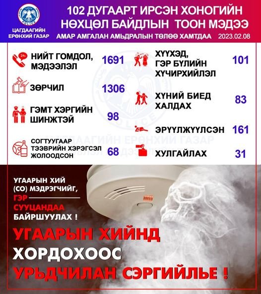 Энэ сарын 08-нд буюу өчигдөр цагдаагийн байгууллагын 102 дугаарын утсанд нийт 1691 гомдол мэдээлэл бүртгэгджээ. Үүнээс зөрчлийн дуудлага мэдээлэл 1306, хулгайтай холбоотой 31, хүүхэд, гэр бүлийн хүчирхийллийн дуудлага 101, гэмт хэргийн шинжтэй 98 мэдээлэл бүртгэгдсэн байна.