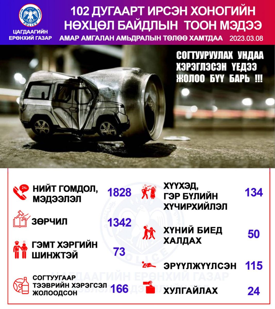 Өчигдөр буюу 03 сарын 08-нд буюу цагдаагийн байгууллагын 102 дугаарын утсанд нийт 1828 гомдол мэдээлэл бүртгэгджээ. Үүнээс зөрчлийн дуудлага мэдээлэл 1342, хулгайтай холбоотой 24, хүүхэд, гэр бүлийн хүчирхийллийн дуудлага 134, гэмт хэргийн шинжтэй 73 мэдээлэл бүртгэгдсэн байна.