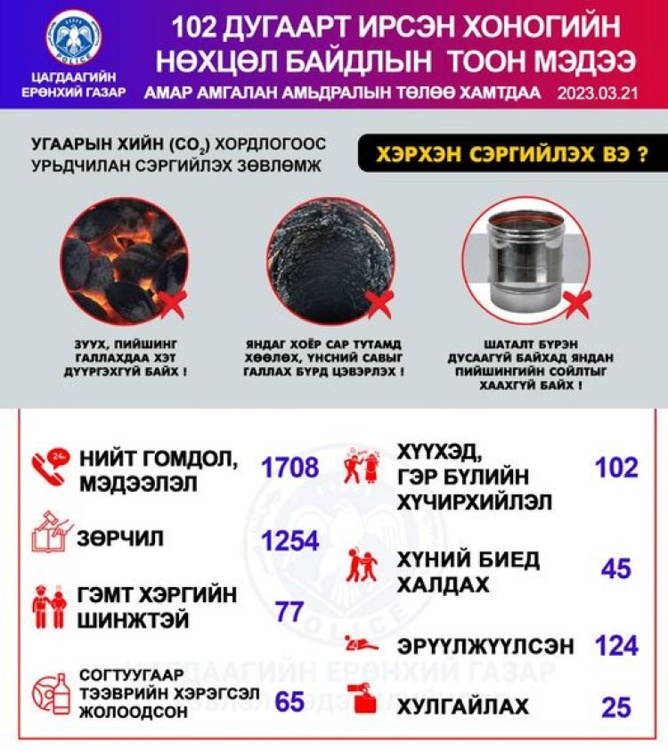 Энэ сарын 21-нд буюу өчигдөр цагдаагийн байгууллагын 102 дугаарын утсанд нийт 1708 гомдол мэдээлэл бүртгэгджээ. Үүнээс зөрчлийн дуудлага мэдээлэл 1254, хулгайтай холбоотой 25, хүүхэд, гэр бүлийн хүчирхийллийн дуудлага 102, гэмт хэргийн шинжтэй 77 мэдээлэл бүртгэгдсэн байна.