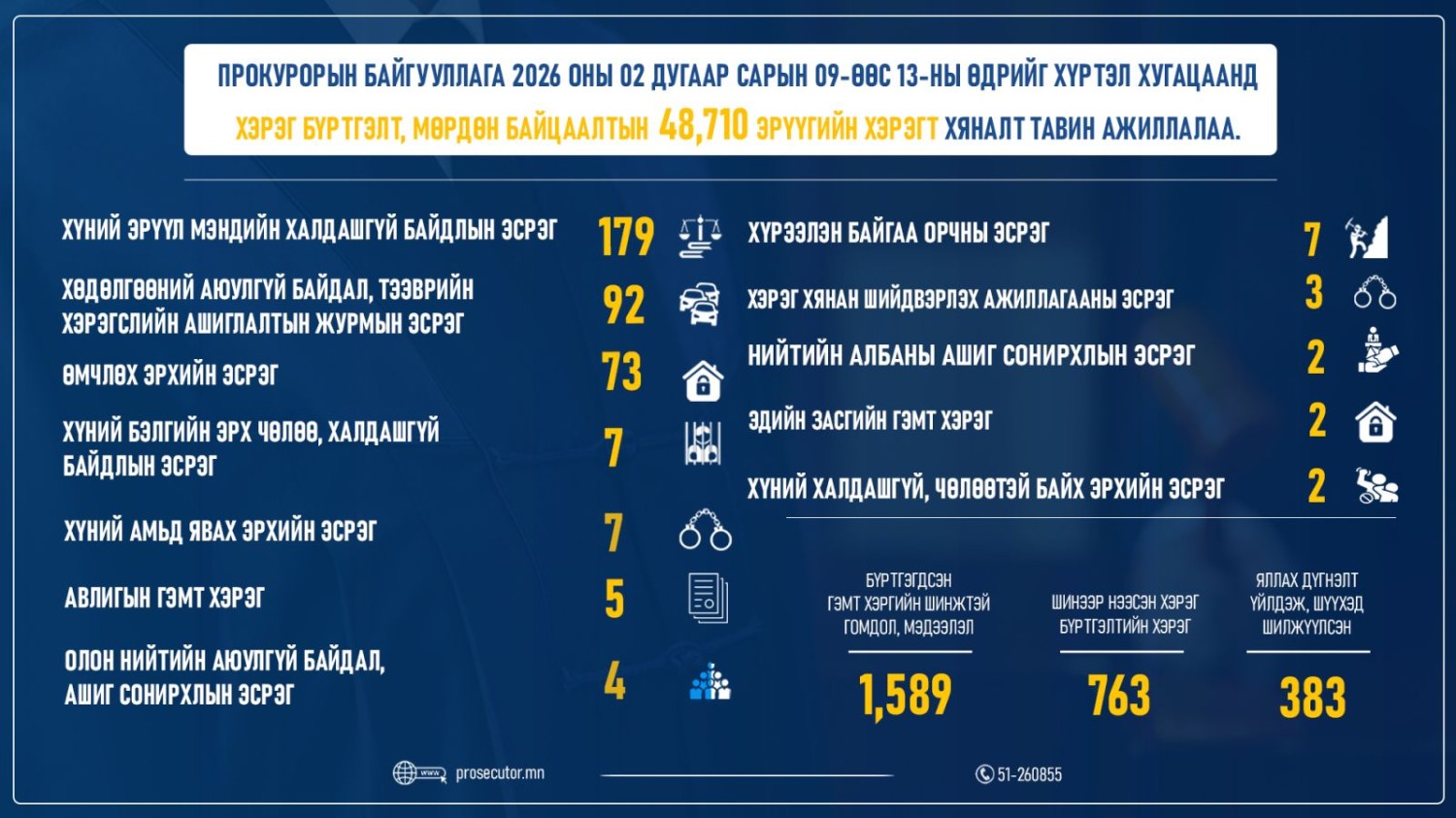 Прокурорын байгууллага 2026 оны 02 дугаар сарын 09-ний өдрөөс 13-ны өдрийг хүртэлх хугацаанд хэрэг бүртгэлт, мөрдөн байцаалтын 48,710 эрүүгийн хэрэгт хяналт тавин ажиллажээ. Дээрх хугацаанд 1,589 гэмт хэргийн шинжтэй гомдол, мэдээлэл бүртгэгдсэн бол хэрэг бүртгэлтийн 763 хэрэг шинээр нээж, 383 хэрэгт прокурор яллах дүгнэлт үйлдсэн байна.