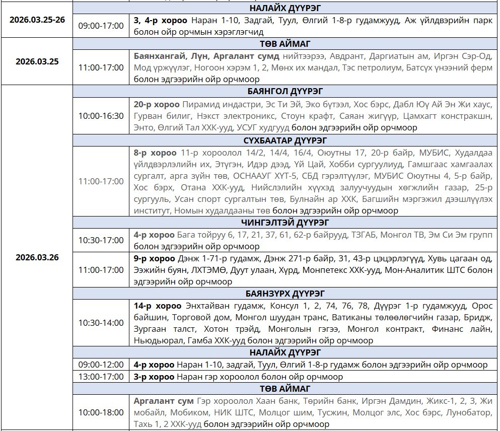 ТАНИЛЦ: Өнөөдөр цахилгаан хязгаарлах байршил, цагийн хуваарь Хуваалцах facebooklink Жиргэх 2026 оны 3 сарын 26 Цахилгааны хязгаарлалт хийж, цахилгаан шугам тоноглолд засвар үйлчилгээ хийх байршлуудын мэдээллийг хүргэж байна. Мэдээнд өгөх таны үнэлгээ? 668137 0 эможи ARSLAN.mn сайтад сэтгэгдэл оруулах: Шинэ мэдээ 2026-03-26 ТАНИЛЦ: Өнөөдөр цахилгаан хязгаарлах байршил, цагийн хуваарь1 цаг 26 минутЯг одоо уншиж байна