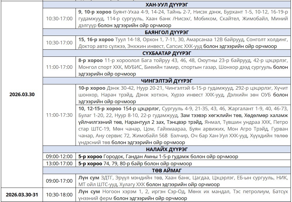 ТАНИЛЦ: Өнөөдөр цахилгаан хязгаарлах байршил, цагийн хуваарь Хуваалцах facebooklink Жиргэх 2026 оны 3 сарын 30 Цахилгааны хязгаарлалт хийж, цахилгаан шугам тоноглолд засвар үйлчилгээ хийх байршлуудын мэдээллийг хүргэж байна. Мэдээнд өгөх таны үнэлгээ? 668176 0 эможи ARSLAN.mn сайтад сэтгэгдэл оруулах: Шинэ мэдээ 2026-03-30 ТАНИЛЦ: Өнөөдөр цахилгаан хязгаарлах байршил, цагийн хуваарь1 цаг 48 минутЯг одоо уншиж байна